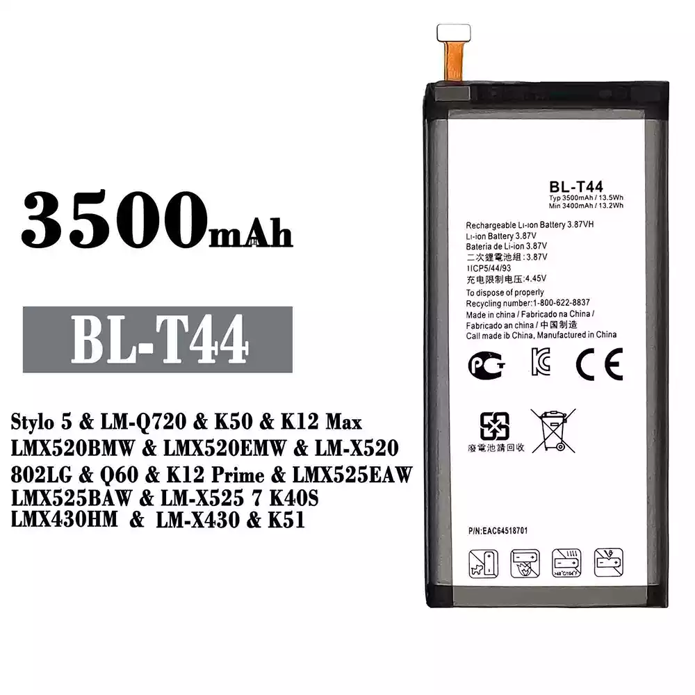 Modelo de batería BL-T44 para LG Stylo 5 / LM-Q720 / K50 / K12 Max / LMX520BMW / LMX520EMW / LM-X520 / 802LG / Q60 / K12 Prime / LMX525EAW / LMX525BAW / LM-X525 7 K40S / LMX430HM / LM-X430 / K51