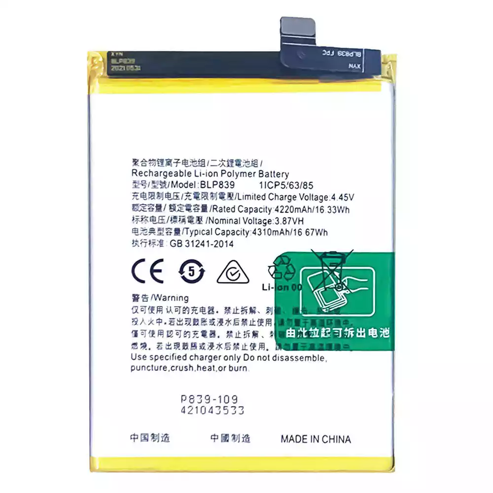 Modelo de batería BLP839 para OPPO A95 5G / A94 5G / Reno 5Z 5G / Reno 6Z / PELM00