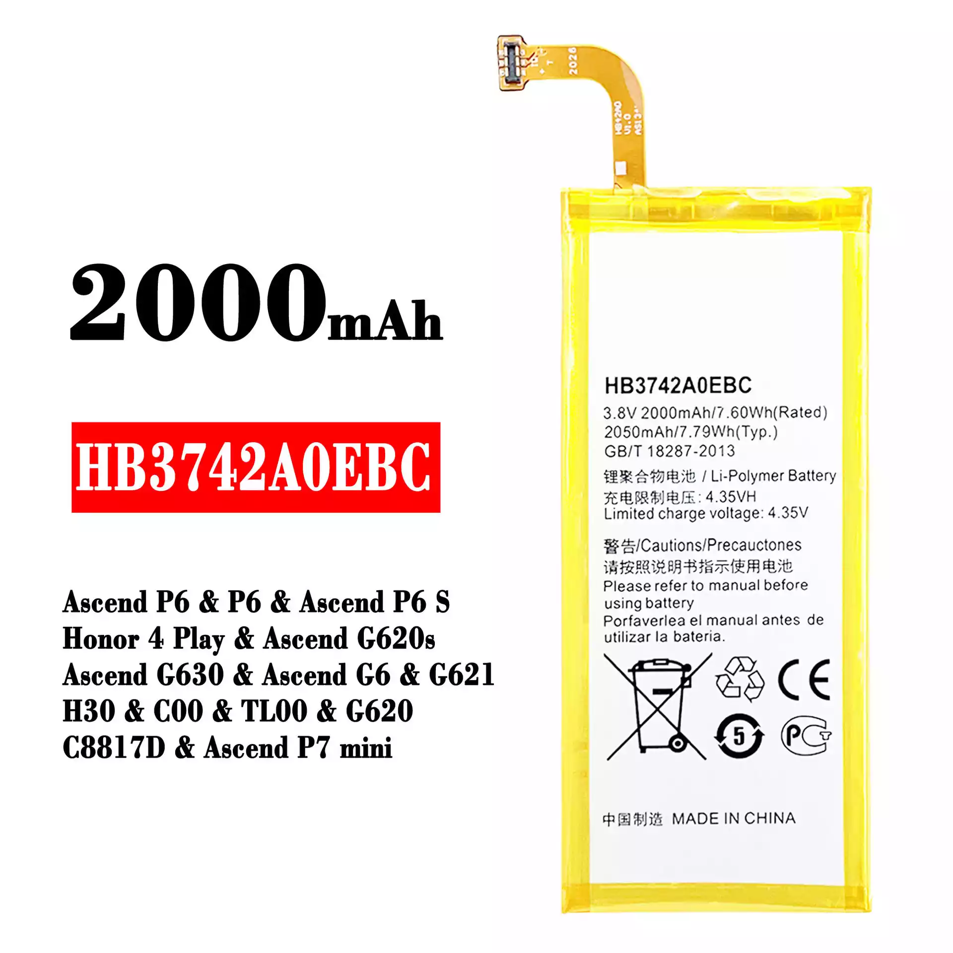 Modelo de batería HB3742A0EBC para HUAWEI Ascend P6 / P6 / Ascend P6 S / Honor 4 Play / Ascend G620s / Ascend G630 / Ascend G6 / G621 / H30 / C00 / TL00 / G620 / C8817D / Ascend P7 mini
