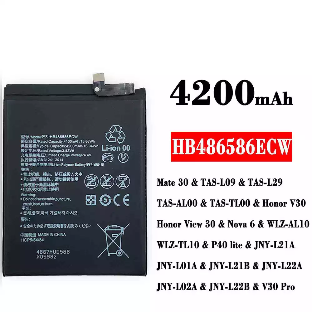 Modelo de batería HB486586ECW para HUAWEI Mate 30 / TAS-LO9 / TAS-L29 / TAS-AL00 / TAS-TLO0 / Honor V30 /Honor View 30 / Nova 6 / WLZ-AL10 / WLZ-TL10 / P40 lite / JNY-L21A / JNY-LO1A / JNY-L21B / JNY-L22A / JNY-LO2A / JNY-L22B / V30 Pro